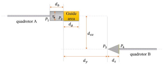 Figure 1. This is a schematic diagram of the docking structure. d y is the distance between P 3 and P 2 on the y-axis, d x z is the distance between P 3 and P 2 on the x z -axis. d b is the depth of quadrotor A docking device, d s is the length of quadrotor B docking device, d g is the length of Guide area, and r b is the diameter of the barrel.