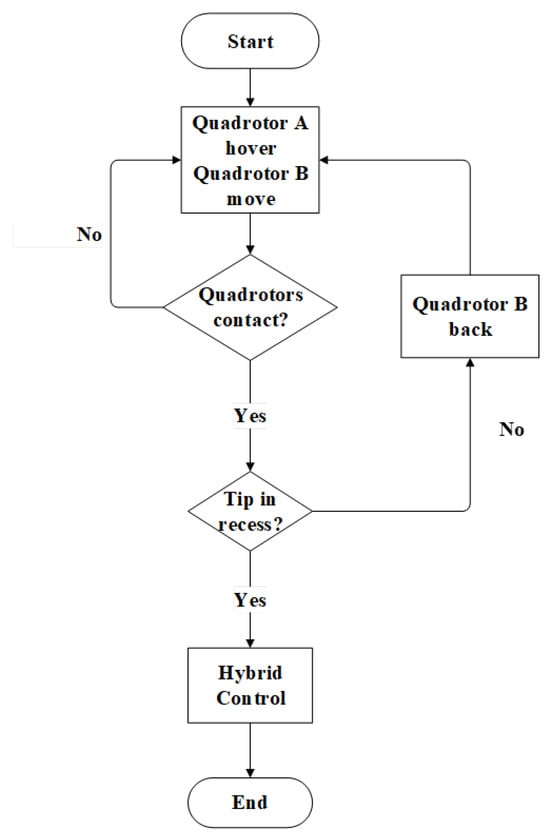 Figure 2. Flowchart of the rule-based expert policy. Initially, quadrotor A remains hovering, while quadrotor B gradually approaches quadrotor A along the y-axis. If contact occurs between the two, it is determined whether the docking conditions (tip is in recess) are met. If they are, force-position hybrid control can be implemented until the target point is reached and docking is completed. If the conditions are not met, to avoid becoming stuck, quadrotor B needs to move back to ensure the disappearance of external forces, and then approach quadrotor A along the y-axis.