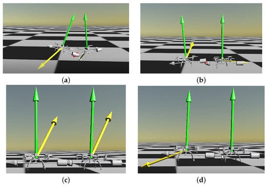 Figure 3. The potential interaction process of expert policy within RaiSim. The green arrow points in the direction of the resultant force, while the yellow arrow points in the direction of the resultant torque. (a,b) illustrate potential scenarios where two quadrotors may become stuck during the docking process; (c,d) depict two scenarios that may occur when two quadrotors successfully dock.