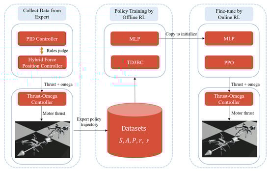 Figure 4. Flowchart of the proposed method. The far left represents the process of collecting data from expert policy. The expert policy comprises a PID controller and a hybrid force/position controller, which are switched and adapted to alter the desired poses of the two quadrotors based on a series of predetermined rules. The policy outputs thrust and angular velocity, which are processed by a thrust-omega controller to generate the thrust values for the four motors of the quadrotor. The four thrust values are then applied to the quadrotor in the RaiSim environment, thereby driving the quadrotor to execute maneuvers. The middle diagram represents the offline RL, which uses TD3BC for training based on the data collected from the expert strategy. And the MLP is a multi-layered perceptron. Finally, in the far right diagram, PPO is used for online fine-tuning.