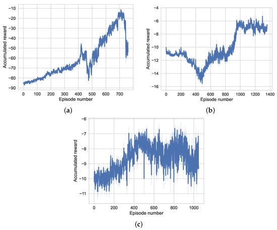 Figure 5. The accumulated rewards are trained via Online RL; (a) is the reward by PPO; (b) is the reward of curriculum learning and AMP; and (c) is the reward of curriculum learning and PPO.