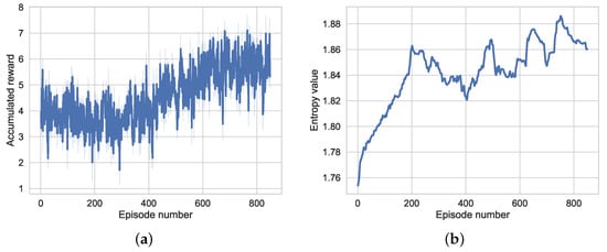 Figure 6. Accumulated reward and entropy curve in the fine-tuning phase; (a) shows the accumulated reward during the fine-tuning phase; (b) represents the entropy curve in the fine-tuning phase.