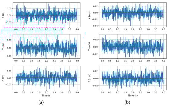 Figure 7. Gaussian noise is incorporated into the state measurements. (a) shows the noise and target values of position; (b) represents the noise and target values of linear velocity. The solid blue line represents the noise in the position and linear velocity. The dashed red line indicates the target values.