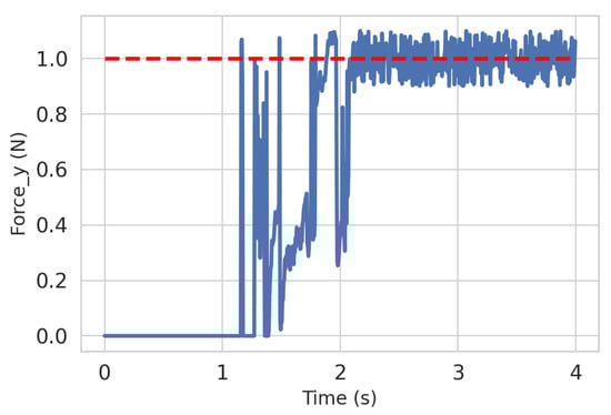 Figure 8. Throughout the completion of the docking task, the external force values generated on the y-axis are tracked. The dashed red line represents the target external force values, while the solid blue line represents the actual values.