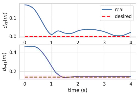 As depicted in Figure 9, the graph represents the variations in the distance, specifically d x z on the x z plane and d y 41 on the y-axis between points P 4 and P 1 , as shown in Figure 1. These distances pertain to the relative positioning of the two quadrotors during the docking process. When the complete coupling is achieved, the desired d y 41 is set at 0.14 m. This illustration substantiates that our approach proficiently administers the stable control of both the separation and complete docking processes of the two quadrotors.