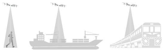 The importance of this technological progress goes beyond just these applications. Mastering the skill of tracking and landing on moving targets is crucial for UAVs, particularly multirotor, as it enhances mission capabilities and improves versatility and efficiency, as shown in Figure 1 []. This proficiency proves essential in various scenarios. In search and rescue operations, envision a UAV autonomously landing on a moving ship in rough seas []. The ability to track and land on moving platforms enables UAVs to navigate and operate in dynamic environments that are otherwise inaccessible by conventional means. In military operations, UAVs can strategically land on moving bases or vehicles for tasks such as refueling, rearming, or data exchange, thereby extending their operational range and enhancing flexibility in combat situations []. In logistics and delivery, precise landings on moving platforms, like trucks or trains, has the potential to revolutionize last-mile delivery, especially in remote or disaster-stricken areas []. Additionally, this capability is invaluable in dynamic surveillance scenarios, where UAVs can track and land on moving objects, such as wildlife or criminal suspects, providing real-time aerial footage from unique vantage points. Furthermore, the concept extends to autonomous refueling, where UAVs can land on refueling stations, effectively prolonging their flight time and enabling continuous operation for extended periods.