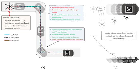 The figure presents the problem definitions as follows: (a) The impact of rotor failure on UAV dynamics and tracking performance; (b) the influence of tracking perturbations caused by wind during landing on a moving UGV.