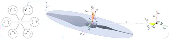 Therefore, the thrust and torque generated by the ith propeller spinning at a rotational speed , as shown in Figure 3, can be expressed as follows: