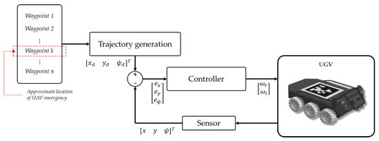This study employs a six-wheel ground vehicle with a tag for detection to guide the UAV and serving as an emergency landing platform. In this section, the guidance, navigation, and control strategy is described to drive the UGV to the approximate location of the UAV emergency area and navigate to the destination.