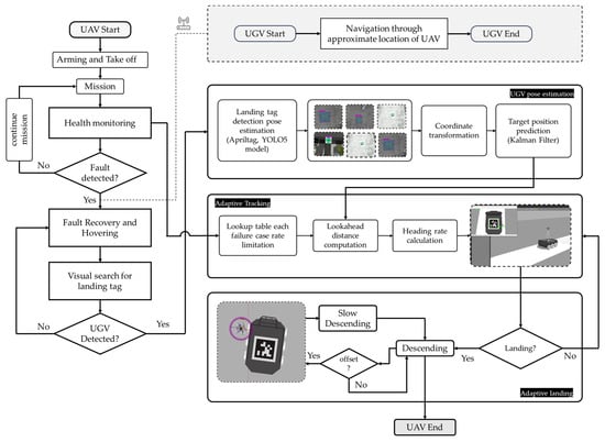 The architecture of the integrated system of UAV-UGV for making emergency landing on a moving UGV is presented in Figure 6. In the very beginning, the UAV with all components working fine is given a mission to perform in scenarios like that of surveying or urban traffic monitoring. During this operation, unintended component failure, specifically actuator failure, will result in controllability degradation that limits the maneuverability, hence halting mission completion. Once the occurrence of the failure is detected by the FDI system of the UAV health monitoring system, the immediate action commonly taken is hovering and trying to regain stability, which is known as the recovery phase. The real-time fault detection and isolation system is adopted from our previous work, as described in []. As discussed in Section 2, the type of hexarotor UAV under consideration has the capability of null controllability for a single actuator failure in the system by redistributing the control command to the other healthy ones. In the meantime, the vision and landing tag detection system is triggered by this signal and starts searching for the existence of safe landing options.