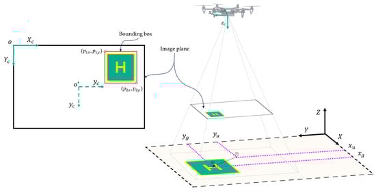 In this section, we develop the method for tracking using a 2D image obtained from the camera mounted on the UAV. Unfortunately, while the UAV is in action, if one of its actuators fails unexpectedly, it results in a reduction in control capability. This limits the UAV’s ability to maneuver effectively, potentially causing the mission to come to a halt. As explained in Section 2, the hexarotor UAV considered in this study can maintain null controllability even with a single actuator failure. This is achieved by redistributing the control command to the remaining healthy actuators. Upon detection of a failure by the FDI system in the UAV health monitoring system, the typical immediate response is to enter the recovery phase, where the UAV hovers and attempts to regain stability. After achieving stability, if the UAV is unable to return home or continue its mission due to degraded control, the vision and landing tag detection system is activated to initiate the search for safe landing options.