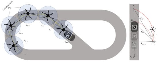 Let us take lookahead point taken from in front of the estimated UGV location, given by , previous lookahead point , given as , and current UAV position , given as . From the current state of the UAV, the lookahead can be calculated as (see Figure 11)
