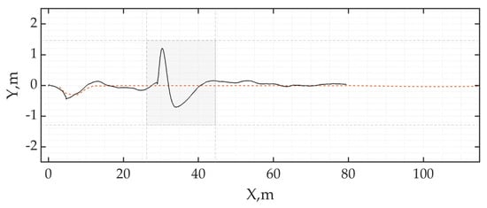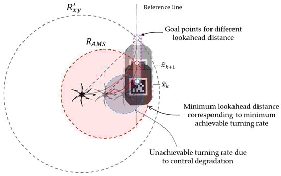 The Pure Pursuit approach establishes a continuous curved trajectory connecting the current UAV position to a point predetermined at a specified distance ahead of the UGV (see Figure 9 and Figure 10) [,,,,]. A reduced lookahead distance necessitates more precise path tracking, improving the system’s ability to follow paths with higher curvature. A smaller lookahead distance leads the vehicle to return to the path more aggressively when separated. Conversely, a longer lookahead distance enables the vehicle to initiate turning before reaching a curve, preventing overshooting upon return and resulting in smoother trajectories. In the event of actuator failure, reducing controllability and maneuverability, the lookahead distance Is dynamically adjusted to avoid sharp turns that require high turning moment force.