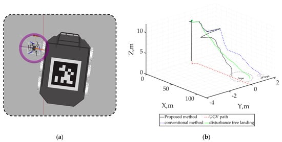 In this scenario, the assessment focused on evaluating the effectiveness of the proposed adaptive landing, which introduces penalties on the descent speed when a tracking error occurs during landing. As illustrated in Figure 18a, an external force was applied in the middle of the landing, causing disturbance and displacement of the UAV from precise tracking. The resulting path of the UAV, depicted in Figure 18b, reveals the perturbation induced in the tracking.