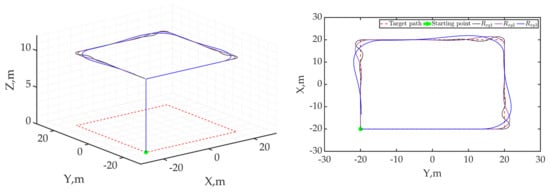 As shown in Figure 20, the UGV followed a rectangular course with four sharp turns. Initially, the UAV was instructed to take off, identify the tag, and estimate the UGV’s position. A reference line was then drawn connecting the previous and current estimated positions of the UGV. The tests analyzed the UAV’s tracking effectiveness and the effects of various lookahead distances on its turning smoothness and agility when navigating sharp turns of the UGV. Three different lookahead distances were evaluated, repeating the simulation for each setting. The results indicated that a longer lookahead distance () resulted in smoother but less accurate turns, which was deemed acceptable. Conversely, a shorter lookahead distance ( = 2 m) led to more precise but aggressive turns, and distances below 1.78 m caused the UAV to fail in tracking the UGV during sharp turns. These findings highlight that adjusting the minimum lookahead distance is crucial for managing the UAV’s limited control capabilities, ensuring that operations stay within feasible limits. The ideal lookahead distance should be determined based on the UAV’s dynamics and the severity of control degradation due to the rotor failure.