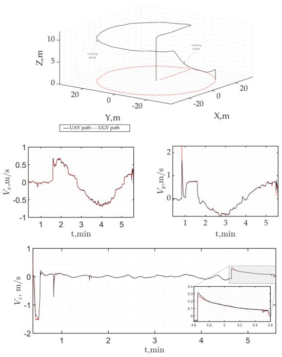 The key observation from the results is that the UAV adeptly follows the moving target, ensuring precise tracking. This, in turn, leads to a seamless landing process where the tracking error () is approximately zero, indicating a highly accurate tracking performance. Importantly, this shows that the proposed adaptive landing strategy imposes no penalties on the descent speed.