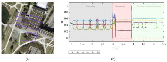 Emergency landing scenario result. (a) Trajectory formed by the UAV flight. (b) Actuators control command in each segment flight scenario. In the recovery phase, the controller reallocates the control command to other healthy ones and stabilizes the system.