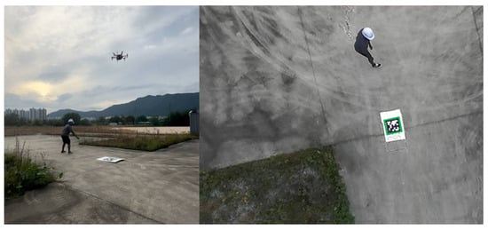 A custom April tag, measuring 0.4 × 0.4 m and equipped with a rope at one edge, was crafted to mimic UGV behavior. In the initial real flight experiment, an integrated UAV hardware setup was deployed to fly at an altitude of 10m and hover. The objective of this experiment was to estimate the pose of the tag relative to the UAV coordinate system. While the UAV hovered, the tag was manipulated using the prepared rope, as illustrated in Figure 25. The UGV module accurately reported the estimated pose.