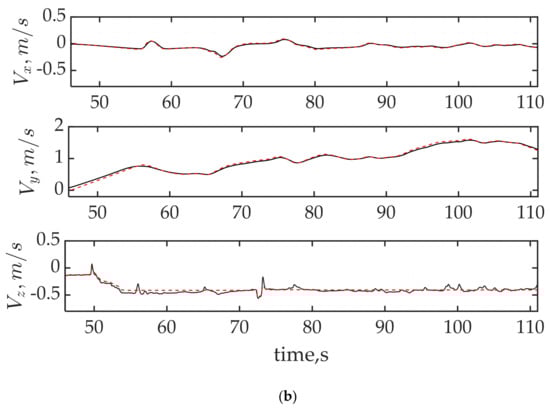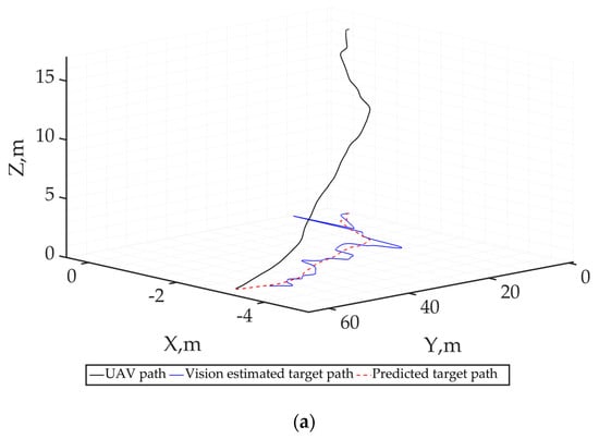The proposed system underwent testing using a crafted board as a moving target for tracking and landing purposes. As illustrated in Figure 26, the tag moved at a roughly constant speed of 1.5 m/s. The position estimation, carried out through an installed camera and an April tag detection model, yielded unsmooth and intermittent results. However, the integration of a Kalman filter algorithm, which treated the tag’s movement as a linear system model, enabled the prediction of the target’s path. This predicted path was then used to create a reference trajectory for the proposed adaptive pure pursuit algorithm. Consequently, the Unmanned Aerial Vehicle (UAV) was able to anticipate the target’s movement, allowing for smoother tracking and landing, as depicted in the figure.