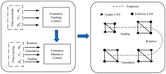 Figure 1 displays the schematic diagram of the formation maneuver control. It stands in contrast to the traditional formation tracking control where the relative bearing, velocity, and distance between leaders remain time-invariant. In maneuver control, changes in relative bearing and desired velocity are introduced, rendering them time-varying. This adaptation enables the achievement of translation, scaling, and rotation maneuver control targets.