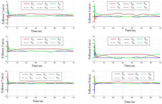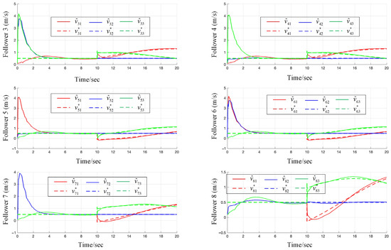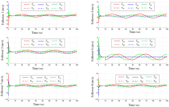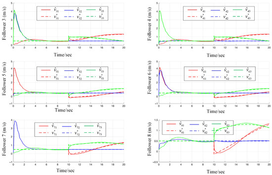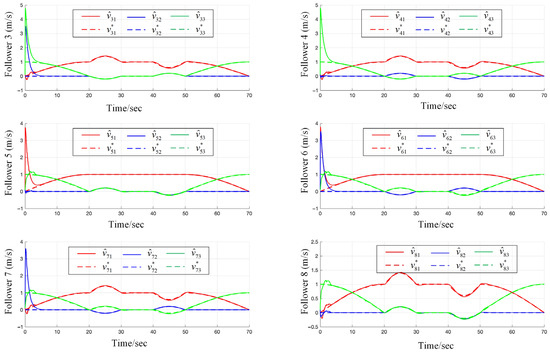 The velocity estimation effect of follower UAV. (a) The velocity estimation effect of follower UAV 3; (b) The velocity estimation effect of follower UAV 4.
