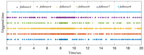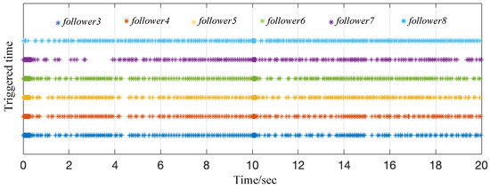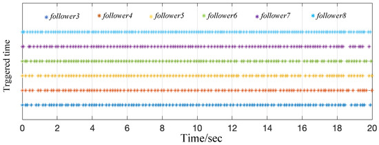 It is worth noting that the dynamic variable plays a crucial role in dynamically adjusting the threshold. When is set to zero, the mechanism shifts to the traditional static event-triggered method. The introduction of the variable can produce larger triggering intervals and reduce triggering times, which will be demonstrated in the subsequent comparison simulations.