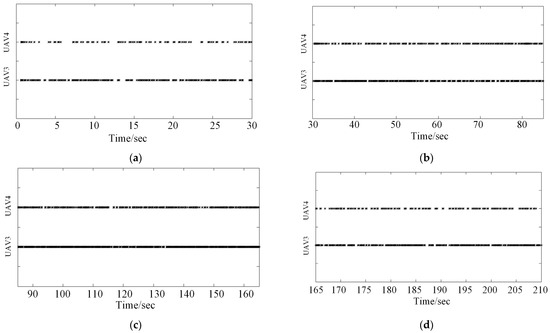 Figure 21 demonstrates the simulation results in the Gazebo simulation environment, specifically illustrating four different control tasks: time-invariant tracking, time-varying tracking, scaling maneuver, and rotation maneuver. The dashed lines clearly mark the flight trajectories of UAVs during each task, showcasing the precision and reliability of the formation control algorithm in maintaining formation structure. Following this, Figure 22 shows UAV flight trajectories based on real flight test data, further validating the algorithm’s effectiveness in practical applications. Figure 23 focuses on the relative orientation errors during various tasks, indicating effective convergence towards minimal error, demonstrating the system’s capability to maintain formation and orientation. Figure 24 analyzes the performance of distributed velocity observers by showing how the estimators accurately track the desired velocities, highlighting the observer design’s effectiveness in dynamic conditions. Lastly, Figure 25 presents the event-triggering moments of the velocity observers, showcasing how a well-designed event-triggering mechanism can ensure communication efficiency while significantly reducing bandwidth and resource consumption.