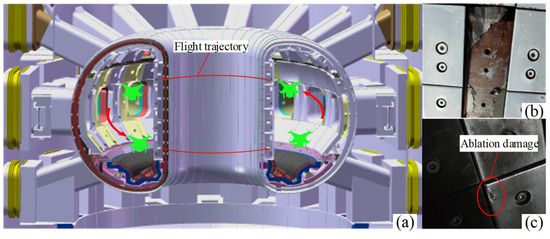 Inspection drone system for fusion reactor environments: (a) working trajectory (follow red arrows); (b) first wall target plate detachment; (c) target plate ablation damage (inside red circle).