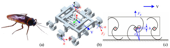 Wheel-legged crawling system design: (a) cockroach crawling gait; (b) principle of wheel-leg structure design; (c) force analysis of wheel-legged crawling system.