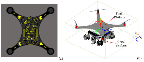 The integrated design of the AAID flight and crawling system: (a) AAID control board design; (b) AAID entire model and coordinate system.
