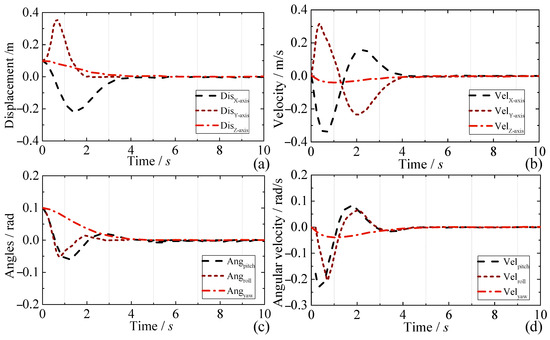 Dynamic response of AAID in hover mode: (a,b) X-axis, Y-axis, and Z-axis direction displacement and velocity; (c,d) pitch, roll, yaw direction angle, and angular velocity.