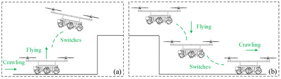 Fly–crawl conversion control process: (a) the AAID detects an obstacle and switches to flight mode; (b) the AAID detects a flat area and switches to crawl mode.