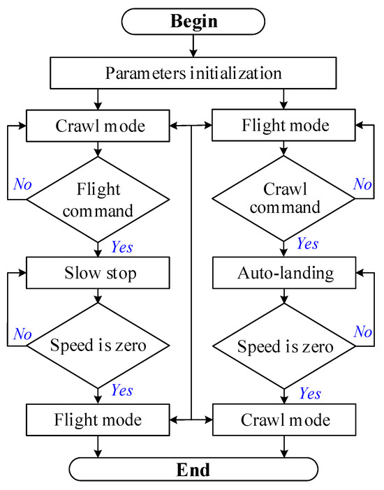 The AAID needs to be capable of stable flight and hovering, as well as flying–crawling transition in appropriate situations. As shown in Figure 6, when an obstacle is found in front of the AAID that cannot be crawled over, the AAID will switch to a flight control mode to achieve obstacle crossing by rotor flight. When encountering a flat road surface, it is necessary to go from flight mode to crawl mode to save energy. The AAID flying–crawling transition control flow is shown in Figure 7. First, the AAID senses whether there is an obstacle in front of it according to the infrared photoelectric sensor; when an obstacle is detected, the infrared photoelectric sensor outputs pulses, which are inputted to the MCU for processing, and then the motor drive module is controlled. At this point, the AAID will stop crawling and sound an alarm. When a flight command is received, the AAID switches to the flight model and crosses the obstacle. Since the AAID flight mode consumes more energy, it needs to be switched to crawl mode when the environment is suitable. The AAID mode switching mainly relies on the barometer to obtain the height. When the AAID reaches a suitable altitude, it starts to decelerate and land, and when the Z-axis speed of the AAID is detected to be zero, it switches to the crawling model and continues to move forward. Repeating the above process can achieve amphibious movement of the AAID.