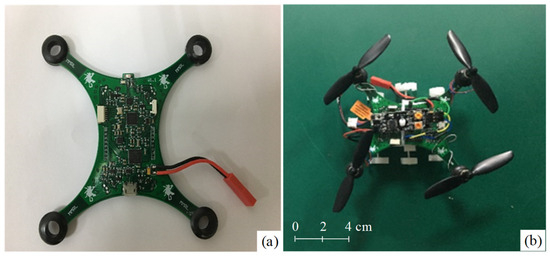 To meet the AAID miniature and lightweight design requirements, the rack is made of PCBs with integrated control circuits, with a size of and a weight of . The control board adopts a four-layer structure; the top and bottom layers have the layout of electronic components, and the power supply layer carries out block power supply to meet the needs of different electronic components, as shown in Figure 8a. The assembled AAID is shown in Figure 8b. The AAID control system is based on a dual MCU model, the main chip is an STM32F411 with a Cortex-M4 core with up to -to- of Flash memory and up to of SRAM. The role of the main control MCU includes sensor data reading, data calculation, power control, wireless communication, etc. As the brain of the AAID, it has a decisive role in stable flight in the air. Besides the main MCU, the AAID has a secondary MCU, the wireless chip NRF51822. Besides wireless communication, it also undertakes power management, power amplification, and other tasks. In the power-off state, the secondary MCU (wireless chip NRF51822) runs on standby and the main MCU (STM32F4111) is in the power-off state. When the system is powered up, the secondary MCU is woken up, and then the main MCU enters firmware mode. The workflow of the AAID control system designed in this paper is as follows: power-on self-test, initialization of the system, receiving remote control commands, setting flight parameters, acquiring flight attitude, data fusion, solving attitude information, calculating control quantities, outputting control signals, and finally completing motion control.
