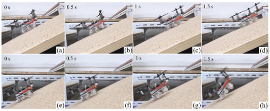 Eight types of rough surfaces, 10-mesh, 12-mesh, 14-mesh, 16-mesh, 18-mesh, 20-mesh, 25-mesh, and 35-mesh, are fabricated by choosing quartzite with different particle diameters as the substrate. The crawling data are recorded three times for each slope during the experiment, and the crawling ability is tested at a constant speed on the surface with different roughness. Figure 9a–d shows the results of the AAID crawling experiment at 14-mesh, slope. The experimental video can be seen in the Supplementary Materials. The AAID can easily crawl over a slope on all types of surfaces with different levels of roughness. When the angle is increased to , the crawler system slips severely, as shown in Figure 9e–h, and overturns after a short distance. When the angle is in the range of –, the risk of overturning is very high, although successful passage is occasionally possible. The main reason for this is that the crawler system will have a slight jump when crossing the obstacle, resulting in a relatively large overturning torque. As shown in Figure 9e–h, when the angle is small (), the reaction force generated is not enough to cause the overturning of the crawling system. When the angle slowly increases, and the vertical component of gravity concerning the inclined plane is not sufficient to counteract the tipping torque generated by , the front side of the fuselage will jump more significantly. Crawling on the inclined surface will cause overturning, resulting in crawling failure. After several tests, the maximum crawling height for stable crawling without overturning is .