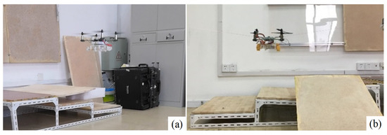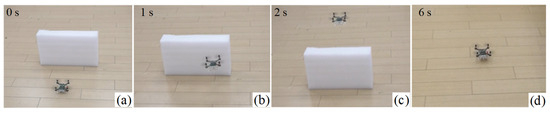 For the AAID fly–crawl conversion experiment, an experimental platform was built indoors, as shown in Figure 12a. When the AAID performs ground crawling, the infrared sensor detects whether there is an obstacle in front of it. If an obstacle appears, the crawling is stopped, and the alarm is issued. After waiting for the flight command to cross the obstacle, it will slowly land on the ground to complete the fly–crawl transition experiment. Figure 12b–d show the process of the AAID encountering and crossing obstacles. The distance from the obstacle when the AAID stops is recorded through several experiments, as shown in Table. 3. It can be seen that the average obstacle avoidance distance of the AAID is at , and this distance is the distance of the foremost motor of the AAID from the obstacle. Considering the size of the AAID propeller, half of the distance of the propeller () needs to be reserved. Then, when the average distance of AAID from the obstacle is , it can realize the automatic shutdown of the crawler system and send out an alarm. To verify the landing stability of the AAID, the experiments of AAID stable landing are counted, as shown in Table 3, and the success rate of AAID stable landing is . The main reason for the landing failure is that the AAID uses a barometer to obtain the height data, which has a certain delay. In addition, the AAID landed stably according to the speed of the Z-axis; due to the rigidity of the AAID, the wheel-leg structure of the ground crawling system will produce a rebound movement when it comes into contact with the ground, so that the Z-axis speed of the AAID was not reduced to when landing, failing stable landing.