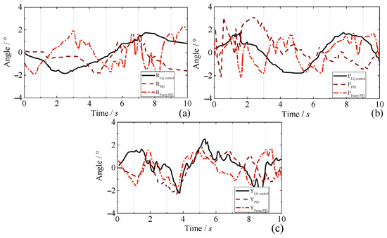 Dynamic response of hovering flight under different control laws. (a–c) Response curves for roll angle, pitch angle, and yaw angle.