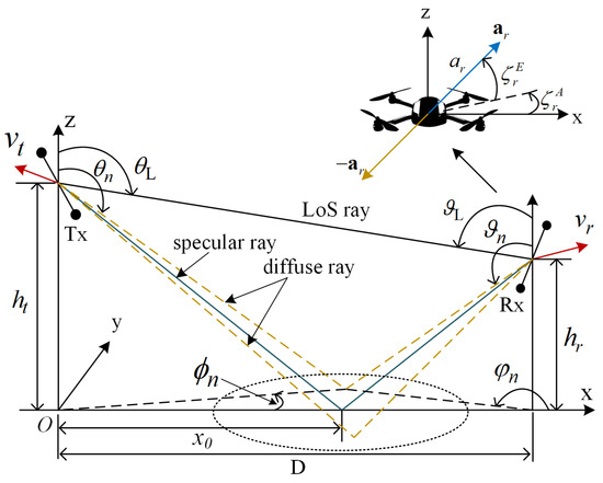 where , , , and denote the ZoD, ZoA, AoD, and AoA of the nth ray, respectively. For the sake of conciseness, the subscript indicates the specular ray, and refers to the diffuse rays. Furthermore, and are the time-varying length and delay of the nth ray, respectively. The phase shift is caused by the interaction of the nth wave with the ground and is obtained as , where returns the angle of a complex number and is the complex reflection coefficient [37]. The modeling details of the above-mentioned parameters are described in the rest of this paper.