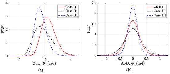 Marginal PDFs of ZoD and AoD of diffuse rays (Case I: m, m; Case II: m, m, m; Case III: m, m). (a) ZoD diffuse rays; (b) AoD diffuse rays.