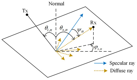 It is important to note that (47) holds true only for smooth surfaces. In the case of a rough surface, the incident wave splits into a specular reflected ray and multiple diffuse rays scattered in various directions, as depicted in Figure 4. Here, a scattering loss factor is introduced to account for the power attenuation via specular reflections due to the scattering effect, as follows [32]: