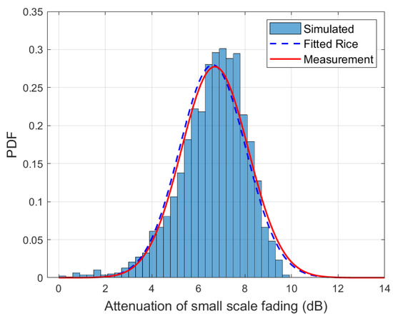 PDF of attenuation of small-scale fading of the proposed model and measurement results in [47] ( GHz, m, m, m, m).