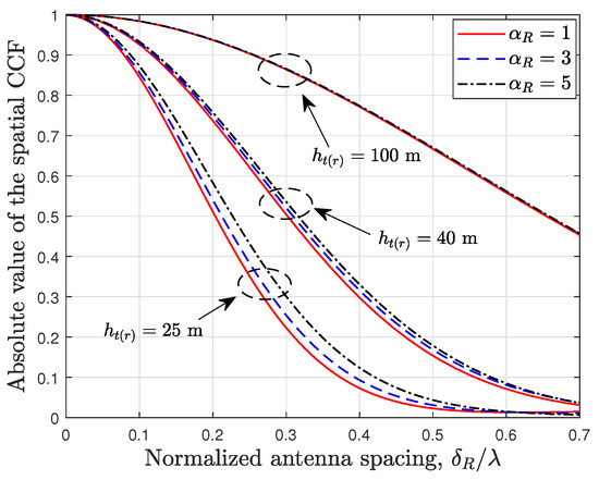 Figure 7 illustrates the spatial CCFs of the proposed model with different UAV heights and scattering-lobe widths. It is found that a large , which results in narrower scattering lobes, increases the spatial CCFs of the model. This implies that an environment with less scattering can increase the spatial correlation of the channel, thereby decreasing the spatial diversity of a MIMO system. Additionally, as the UAV height increases, the spatial correlation becomes higher due to the smaller angular spread. With the same horizontal distance between the Tx and Rx, a greater UAV height of 100 m results in increased path loss for the diffuse rays. Consequently, the A2A channel is primarily dominated by the LoS ray. As a result, the influence of the scattering-lobe widths on the spatial CCF becomes negligible.