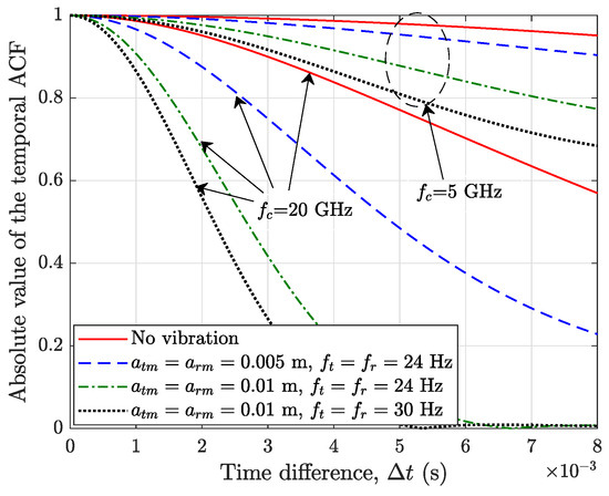 Figure 8 shows the temporal ACFs of the proposed A2A channel model with different vibration amplitudes, vibration frequencies, and carrier frequencies. It can be observed that an increasing vibration amplitude or vibration frequency results in a lower temporal correlation of the channel, implying a faster time variation in the channel over time. A noteworthy insight observed from the results is that the temporal ACF demonstrates a high sensitivity to UAV vibrations when the system operates at high-frequency bands. A higher carrier frequency makes the channel decorrelate over time more rapidly. The underlying reason for this is that the antenna vibration induces a larger phase rotation of the wave with a shorter wavelength, leading to a rapidly time-varying channel and a lower temporal ACF. This result aligns with the theoretical analysis in (23), which indicates that a higher carrier frequency or a shorter wavelength results in a larger Doppler frequency caused by the antenna vibration, leading to a rapid decorrelation of the channel over time.