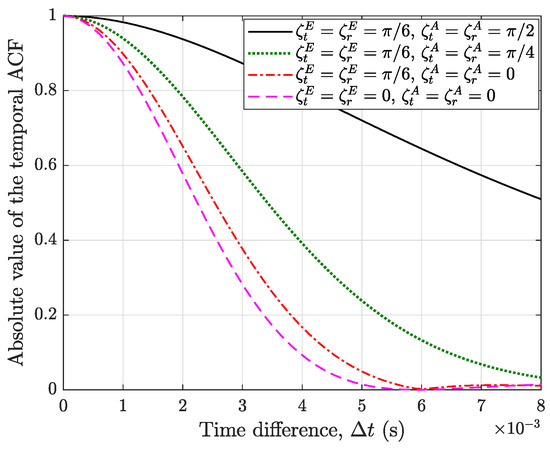 Figure 9 illustrates the impact of UAV vibration angles on the temporal ACFs of the proposed model. The analysis reveals that the strongest temporal correlation occurs when the UAVs vibrate perpendicular to the line connecting the Tx and Rx. As the vibration azimuth angle decreases, the temporal ACF gradually reduces. Moreover, the temporal ACF further reduces by decreasing the vibration elevation angle. Note that in the case of rotary-wing UAVs, vibration is mainly caused by the imbalance in the rotor blades, leading to predominantly horizontal vibrations. This can cause a significant decrease in the temporal ACF and result in rapid temporal variations in the channel.