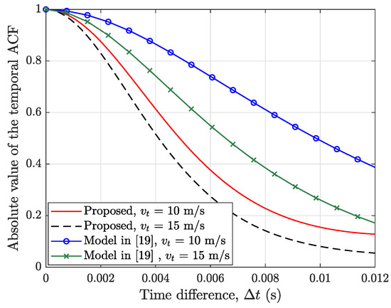 Comparison of the proposed A2A channel model and the model in [19] in terms of temporal ACF for different speeds of the transmit UAV ( GHz, GHz, m, m, m).