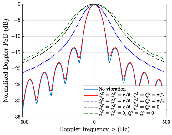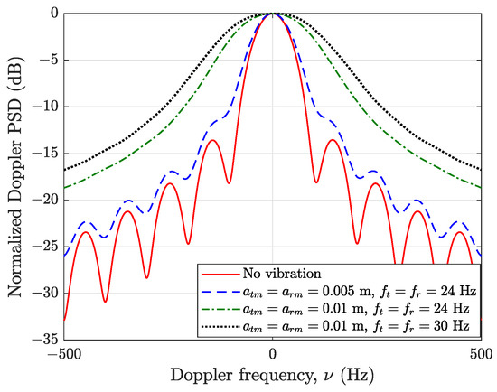 This expression indicates that the antenna vibration introduces a series of sidebands at frequency offsets . The PSDs of the LoS path with different carrier frequencies are shown in Figure 2. To facilitate the analysis, we set m/s, Hz, and the antennas vibrate with a fixed amplitude, i.e., m. In accordance with the aforementioned analysis, the PSDs show that abundant harmonic components occur at integer multiples of 20 Hz. For a low carrier frequency, i.e., 2 GHz, the sidebands decrease significantly with the increase in the harmonics. However, under the same degree of vibration, increasing the carrier frequency, e.g., to 28 GHz, results in a large amount of power being transferred to the harmonic components due to the shorter wavelength.