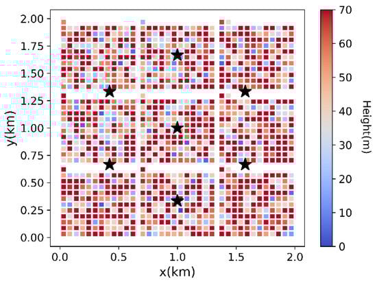In this paper, the UAV operates in the airspace above a dense urban area measuring 2 km × 2 km. The height and locations of urban buildings are generated using the statistical model recommended by the International Telecommunication Union (ITU). This model involves three parameters: , which represents the ratio of land area covered by buildings to the total land area; , which denotes the average number of buildings per unit area; and , a variable determining the distribution of building heights following a Rayleigh distribution, with a mean value of (). Figure 2 shows the 2D views of one particular realization of the building locations and heights with , , and . For convenience, the building height is clipped to not exceed 70 m.