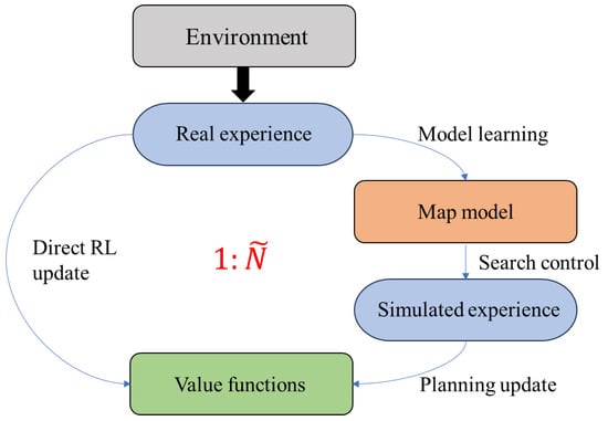 Due to the lack of prior environmental knowledge, relying solely on the actual flight of UAVs not only incurs high training costs and a slow learning process, but also poses a significant risk of accidents. To address this issue, we propose the SNARM framework in this paper, which utilizes UAV measurement signals during flight to generate a simulated 3D radio map and create a virtual flight trajectory. By doing so, the UAV can predict the expected outcome for each path without physically traversing, thereby reducing the cost of measured flight and mitigating potential risks. Furthermore, we employ the Dyna framework to integrate simulation experience with real-world experience in updating UAV flight strategies within deep learning algorithms, thus enhancing the accuracy of neural network. The Dyna framework is shown in Figure 3 below.
