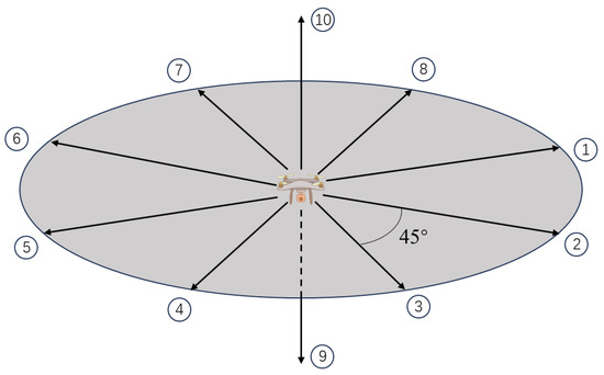 - Action: The action space A corresponds to the UAV flying direction. Considering the limited vertical range of the UAV’s flying area, the action space of the UAV consists of 10 directions, including 8 horizontal directions spaced 45 degrees apart, as well as upward and downward directions, as shown in Figure 4. The selection of UAV motion direction relies on the model’s estimation of the Q value for each direction in specific position.