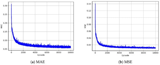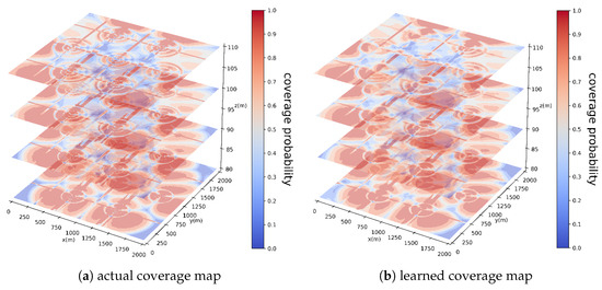The actual global coverage of the 3D region under consideration is depicted in Figure 6a, which is obtained through numerical simulations using a computer based on the aforementioned model of the 3D environment and channel. Therefore, direct utilization of this simulated data in the algorithm is not feasible. As shown in Figure 6a, due to the combined influence of GBS antenna inclination and building occlusion, the coverage map exhibits irregularities in high altitude areas, while low altitude areas demonstrate a more regular pattern. Figure 6b illustrates the spatial 3D coverage probability map acquired from radio mapping. By comparing Figure 6a with Figure 6b, it is evident that the acquired CPG exhibits a remarkable alignment with its corresponding actual counterpart, thereby substantiating the effective application of SNARM in path learning. The algorithm effectiveness was further verified through simulations, which evaluated the MSE and mean absolute error (MAE) of the learned radio map in relation to the episode count, as depicted in Figure 7. MSE and MAE are derived by comparing predicted outage probabilities obtained from radio network measurements against actual outage probabilities at randomly selected locations. Episodes ranging from 0 to 500 correspond to an initial learning stage where large MSE and MAE values indicate poor quality of initially learned radio maps. However, as episode count increases, accumulating more signal measurement data leads to gradual decline in both MSE and MAE values, indicating improved approximation between learned radio maps and real maps.